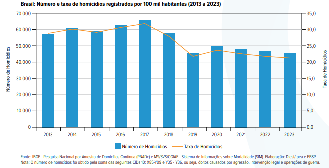 No Brasil, a taxa de homicídios foi reduzida para 21,2 a cada 100 mil habitantes em 2023. O resultado corresponde a uma queda de 2,3%, em relação ao ano imediatamente anterior. Os dados constam no Atlas da Violência, divulgado nesta semana pelo Instituto de Pesquisa Econômica Aplicada (Ipea) e pelo Fórum Brasileiro de Segurança Pública (FBSP).